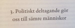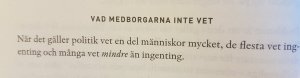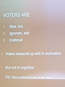 Väljarkåren är till och med systematiskt inkompetent under ett val och fattar beslut som grundar sig på okunskap och irrationalitet. Dessutom gör politik medborgare, familjemedlemmar och vänner till varandras fiender i mer eller mindre grad. I Sverige är det påtagligt om man öppet medger sympatier för SD.